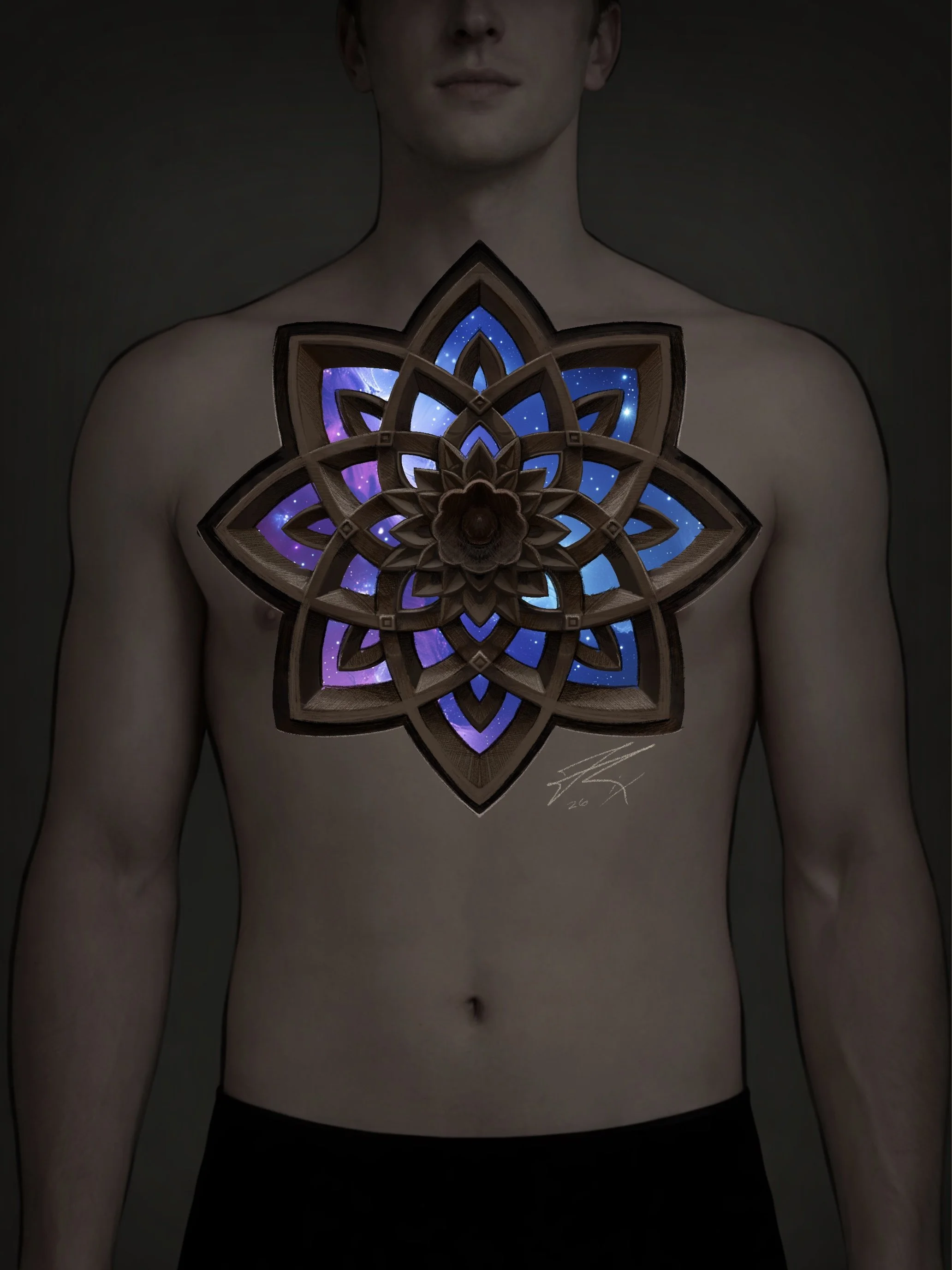 The chest mandalas can use the background shown in the images, or we can change them based on color PREFERENCES.